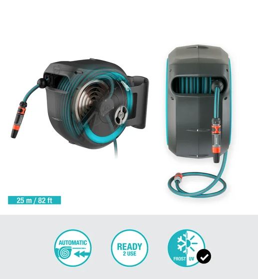 GARDENA Bęben naścienny 25 roll up to wysokiej jakości produkt charakteryzujący się komfortowym użytkowaniem dzięki zastosowaniu automatycznego zwijacza. Bęben mocowany jest na ścianie budynku – można go obracać o 180°.