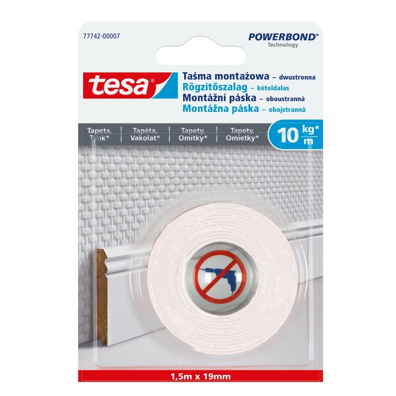Praktyczna, dwustronna taśma montażowa do tapet i tynku tesa® w mniejszym nawoju do trwałej aplikacji płaskich przedmiotów dekoracyjnych i użytkowych to innowacyjne rozwiązanie przeznaczone do delikatnych litych i chropowatych ścian. Nie wymaga żądnych narzędzi – wystarczy uciąć odpowiednią ilość taśmy, zaaplikować ją do przytwierdzanego przedmiotu a następnie wszystko mocno docisnąć do ściany. Maksymalnym, zalecanym ciężarem, z jakim bez problemu poradzi sobie taśma jest 6 kg.