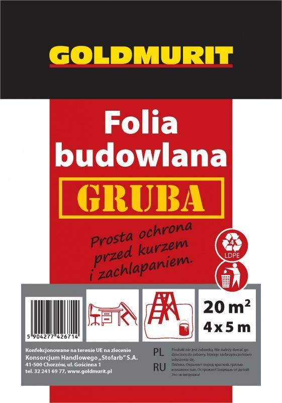 Folia budowlana Goldmurit o wymiarach 4 m x 5 m i wadze 800 g to wytrzymały materiał przeznaczony do zabezpieczania powierzchni podczas prac budowlanych i remontowych.