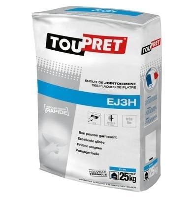 Francuski gips szpachlowy do łączenia płyt Toupret EJ3H. Produkt na bazie produktów z kamieniołomów oraz środka wiążącego celulozowego. W stosunku do standardowych produktów na rynku wyróżnia go otwarty czas pracy wynoszący 3 godz.