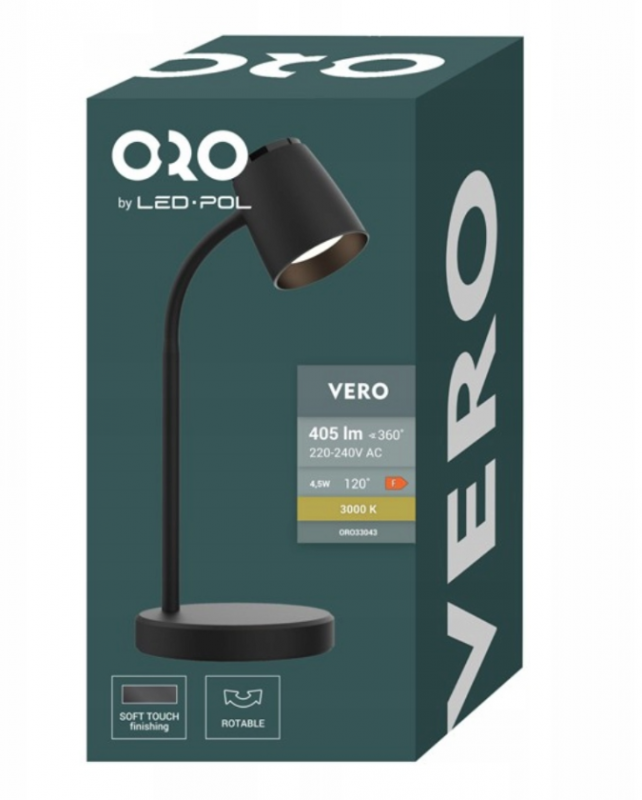 Lampa biurkowa Vero LED w kolorze czarnym o mocy 4,5W i jasności 405lm to eleganckie i funkcjonalne oświetlenie, idealne do biur i miejsc pracy. Wyposażona w technologię LED, zapewnia jasne, neutralne światło, które zmniejsza zmęczenie oczu podczas długotrwałej pracy. Jej nowoczesny design i elastyczne ramię pozwalają na wygodne ustawienie kąta padania światła, co zwiększa komfort użytkowania.