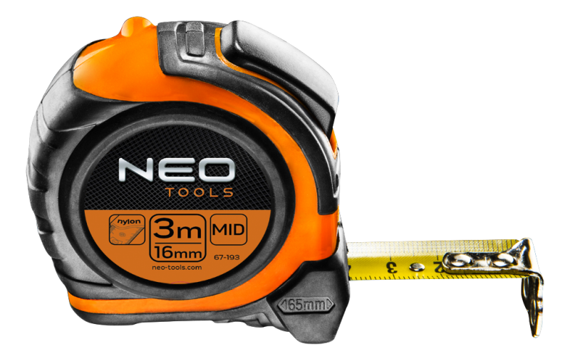 Miara zwijana stalowa NEO o długości 3 m z dwiema blokadami zwijania taśmy. Taśma posiada dwustronny nadruk, co ułatwia mierzenie okien, wysokości sufitu. Pokrycie taśmy nylonem chroni nadruk przed ścieraniem. Magnetyczna końcówka oraz profilowanie taśmy ułatwiają dokonanie pomiaru. Amortyzator zwijania taśmy oraz 3 nity zabezpieczają hak przed zerwaniem. Ergonomiczny kształt obudowy umożliwia pewny i wygodny chwyt, a antypoślizgowy materiał zapewnia komfort i bezpieczeństwo podczas pracy. Gwarantem niezawodności jest wykonanie zgodne z unijną dyrektywą o przyrządach pomiarowych MID.