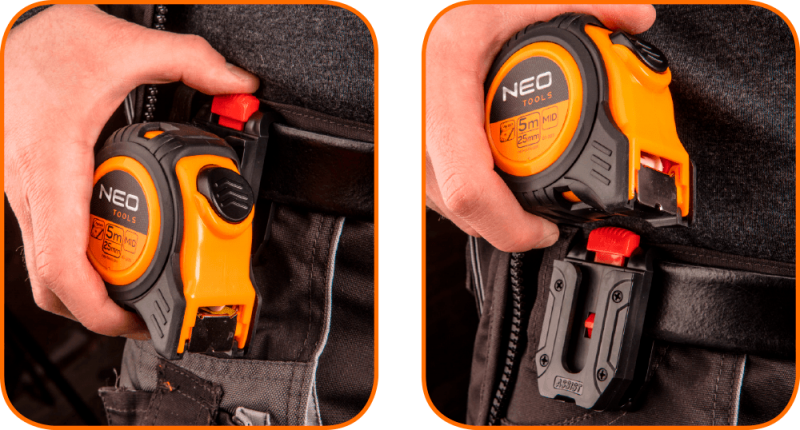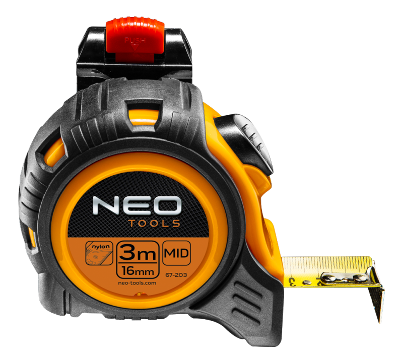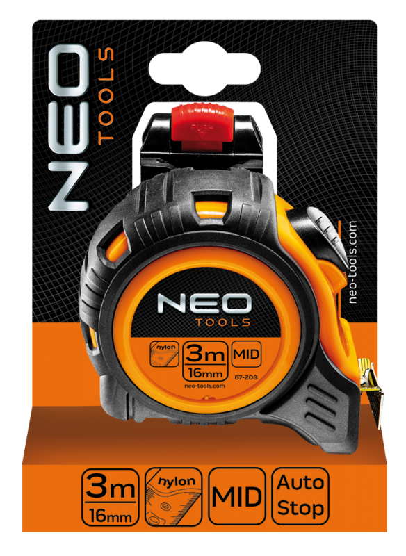 Miara zwijana stalowa NEO posiada automatyczną blokadę zwijania taśmy. Pokrycie taśmy nylonem chroni nadruk przed ścieraniem, a odpowiednie wyprofilowanie ułatwia dokonanie pomiaru. Solidna konstrukcja obudowy zapewnia odporność na uderzenia, a ergonomiczny, antypoślizgowy materiał umożliwia pewny i wygodny chwyt. Gwarantem niezawodności jest wykonanie zgodne z unijną dyrektywą o przyrządach pomiarowych MID.