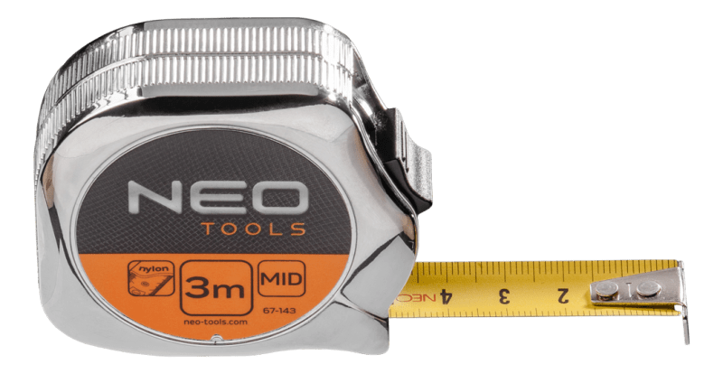 Miara zwijana stalowa NEO posiada blokadę zwijania taśmy. Pokrycie taśmy nylonem chroni nadruk przed ścieraniem, a jej odpowiednie wyprofilowanie ułatwia dokonanie pomiaru. Amortyzator zwijania taśmy zabezpiecza hak przed zerwaniem. Ergonomiczny kształt obudowy umożliwia pewny i wygodny chwyt. Gwarantem niezawodności jest wykonanie zgodne z unijną dyrektywą o przyrządach pomiarowych MID.