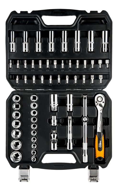 Zestaw kluczy nasadowych 1/2″ NEO składa się z 58 elementów, wykonanych z wysokiej jakości stali chromowo-wanadowej. W skład zestawu wchodzi odgięta grzechotka, wyposażona w trwały mechanizm zapadkowy (72 zęby) i ergonomiczny uchwyt. Zestaw zawiera bogaty pakiet nasadek (w rozmiarach od 10 do 32 mm) i końcówek wkrętakowych (płaskie, krzyżowe, sześciokątne, Torx). Uzupełnieniem są przedłużki, pokrętło, przegub uniwersalny, adapter do bitów i nasadki do świec. Całość jest dostarczona w praktycznej i solidnej walizce z tworzywa sztucznego. Niezawodność produktu potwierdza 25-letnia gwarancja.