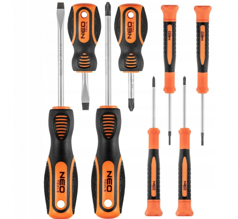 Zestaw wkrętaków NEO zawiera 4 wkrętaki: płaskie i krzyżowe. Grot wkrętaka wykonany jest z wyjątkowo wytrzymałej stali chromowo-molibdenowej. Końcówka robocza grota została poddana obróbce cieplnej, dzięki czemu uzyskano odpowiednią twardość i odporność na zgięcia 56 HRC. Wkrętak posiada magnetyczną końcówkę. Trójgraniasty kształt uchwytu z wyprofilowanym oparciem dla kciuka zmniejsza obciążenie dłoni podczas pracy i ułatwia uzyskanie optymalnego momentu obrotowego. Uchwyt dwumateriałowy zapobiega ślizganiu się w dłoni, odporny jest na działanie chemikaliów, olejów i smarów. Jakość narzędzia potwierdzona certyfikatem TÜV i 25-letnią gwarancją producenta.