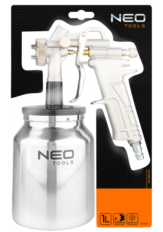 Wysokiej klasy pistolet natryskowy Neo 12-530 z dolnym zbiornikiem o pojemności 1 l ze stali nierdzewnej. Posiada dyszę o średnicy 1,4 mm, zużycie powietrza 250-350 l/min, maks. ciśnienie robocze 4 bary.