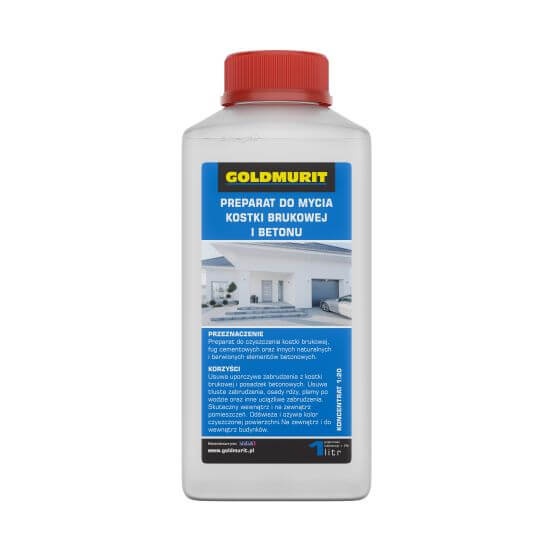 Preparat do mycia kostki brukowej marki Goldmurit to skuteczny środek przeznaczony do usuwania zabrudzeń z powierzchni kostki brukowej oraz innych materiałów budowlanych.