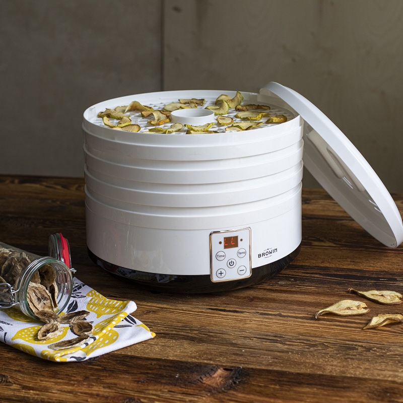 Duża, biała suszarka do żywności o mocy 500 W z regulacją temperatury pozwala na przyrządzenie zdrowych, pełnych wartości odżywczych suszonych owoców, warzyw, grzybów, mięs czy ziół bez potrzeby dodawania konserwantów, soli czy cukrów.