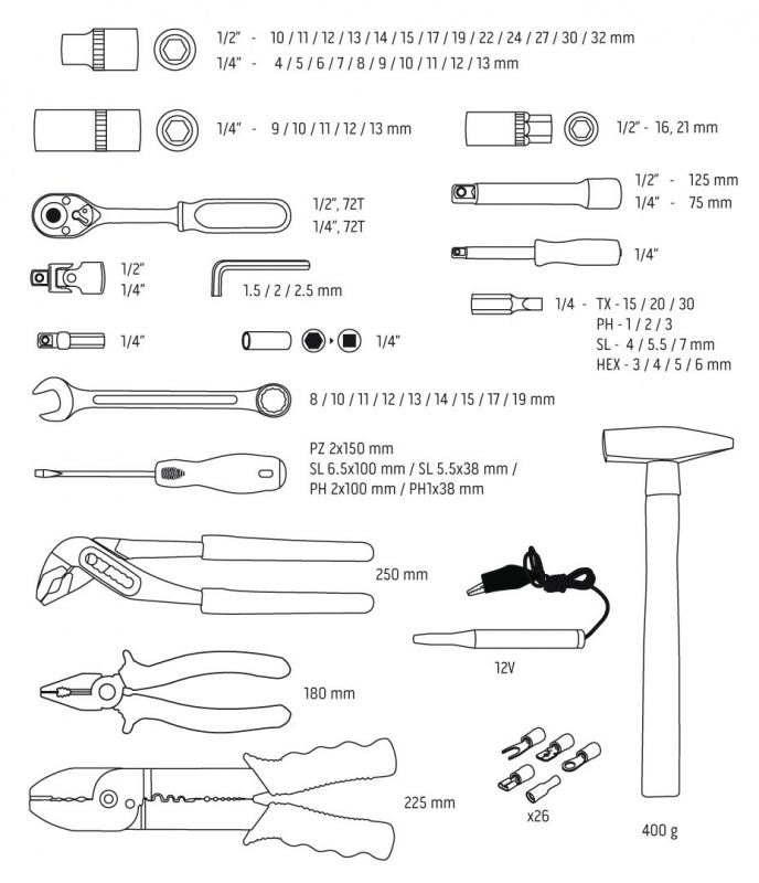 Zestaw narzędzi składa się ze 100 elementów uporządkowanych w poręcznej walizce z tworzywa sztucznego. Wszystkie elementy cechuje wysoka jakość wykonania a ich uniwersalność sprawia, że będą przydatne w pracach mechanicznych, elektrycznych, jak i hydraulicznych. Narzędzia występują w dwóch rozmiarach: Rozmiar 1/2” to możliwość używania dużych sił a Rozmiar 1/4” to możliwość stosowania w trudno dostępnych miejscach. Każdy rozmiar ma w zestawie precyzyjną grzechotkę o 72 zębach (skok 5o)